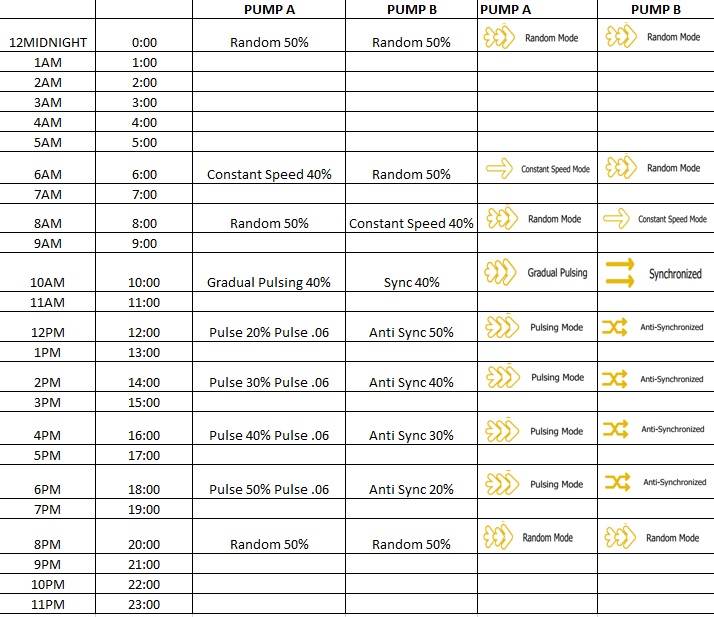 If you own the Maxspect Gyre with the advanced controller and run 2 pumps below are the settings you need!